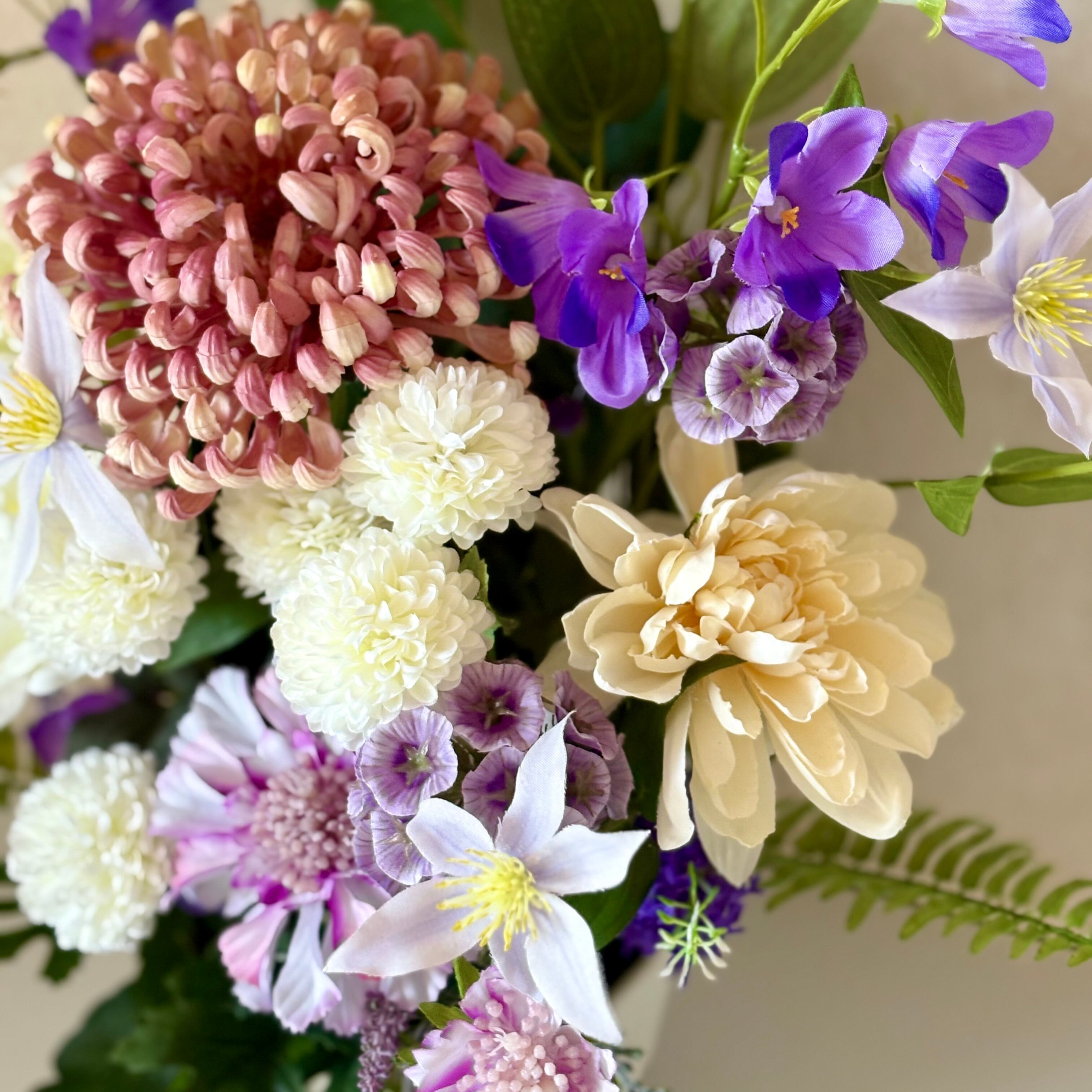 クレマチス・カンパネラ・スカビオサ・トルコキキョウ・小菊など、仏花でありながらも色彩豊かに、艶やかで上品な雰囲気に仕上げました。