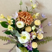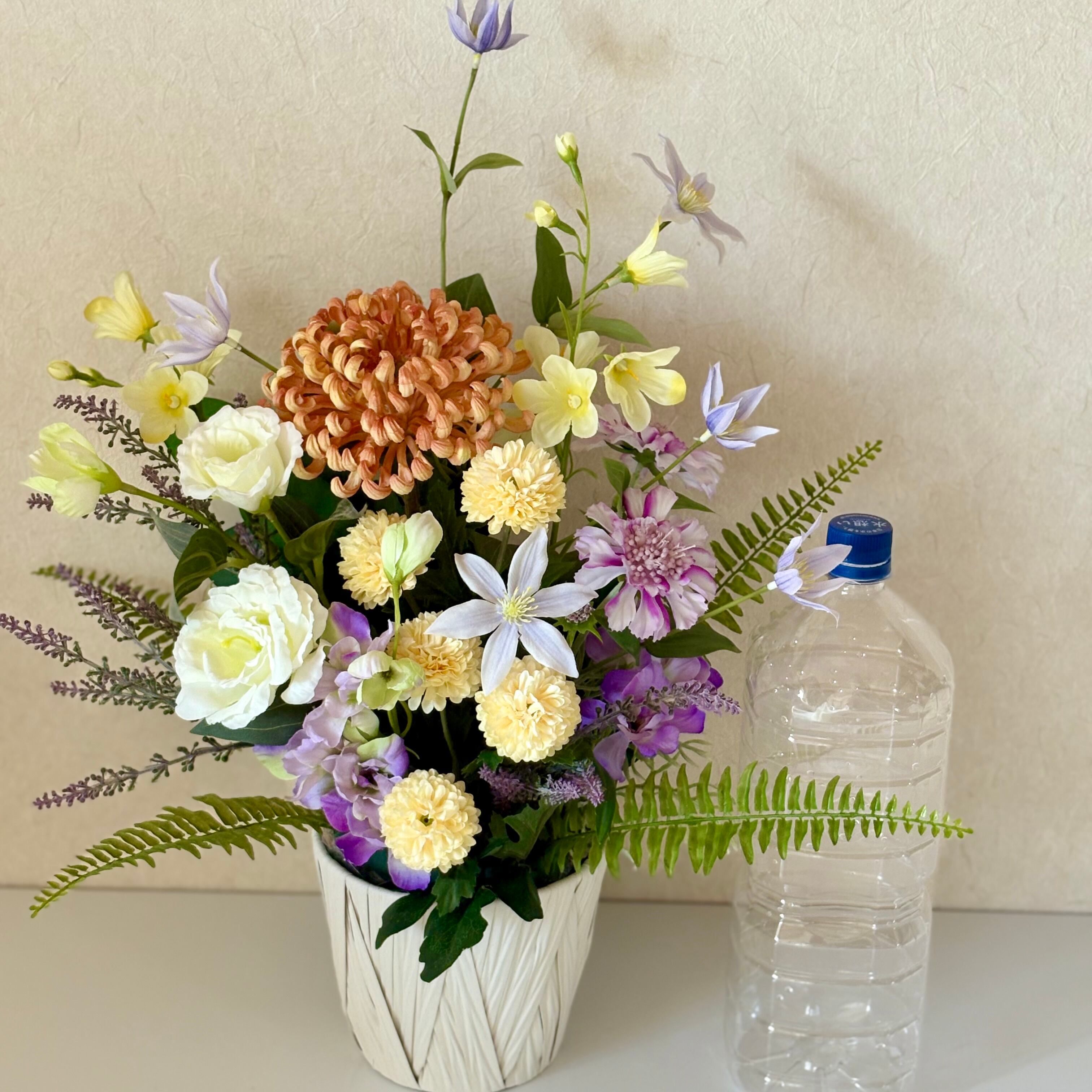 こちらは、最高品質のアーティフィシャルフラワーで丁寧にお作りした、夏の季節にふさわしい供花アレンジメントです。