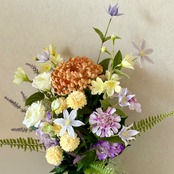 クレマチス・カンパネラ・スカビオサ・トルコキキョウ・小菊など、仏花でありながらも色彩豊かに、艶やかで上品な雰囲気に仕上げました。