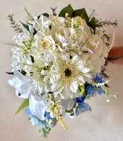 純白のリリーやガーベラ、ブルーの紫陽花やデルフィニウムを中心に束ねた、爽やかで上品なカスケードスタイルのウェディングブーケです。