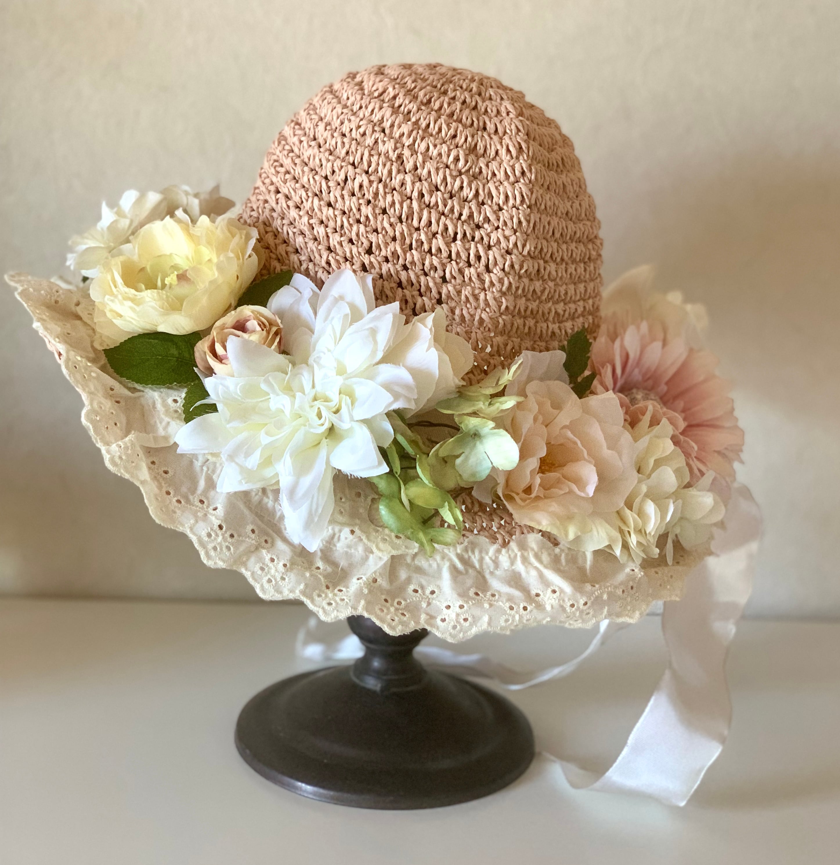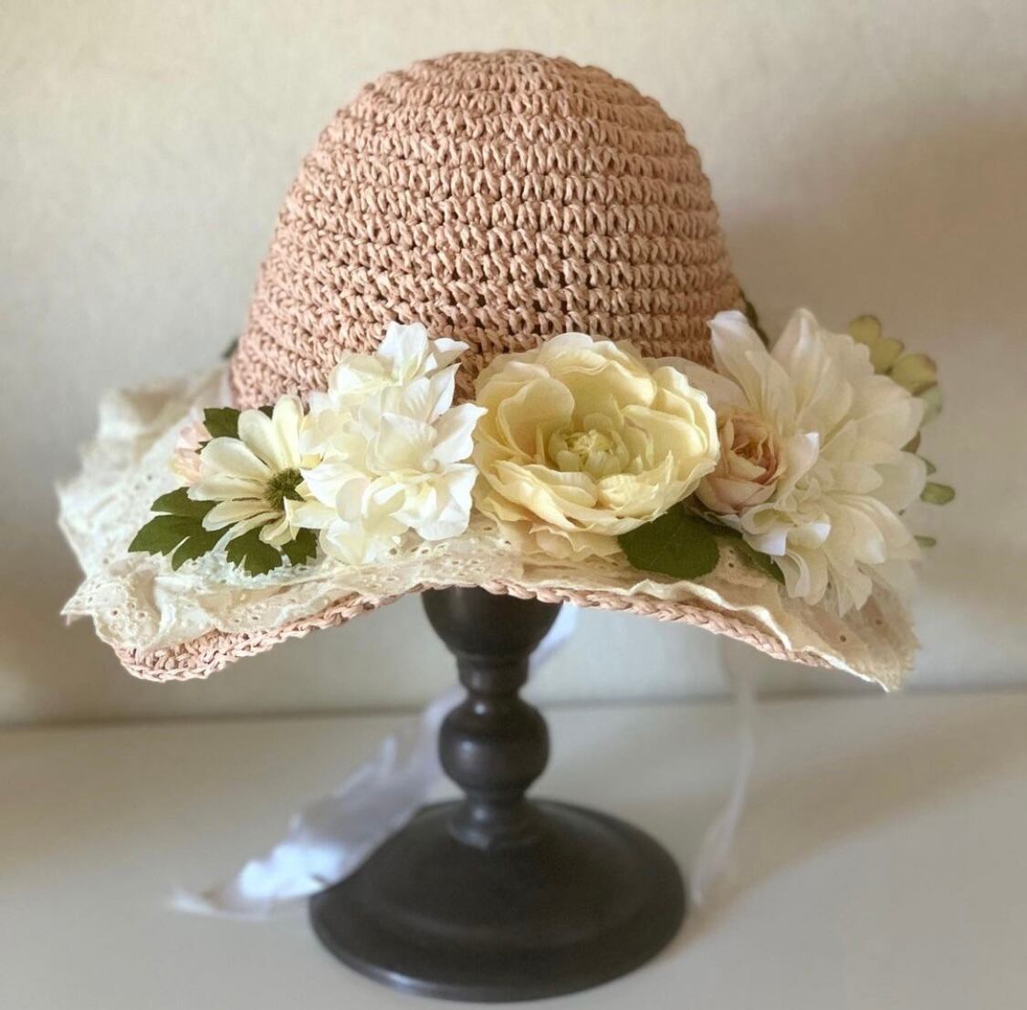 素材はペーパーを編んだもので、くすんだアプリコット系のピンクです。つばにはコットンのアイレットレースをはり、全体の4分の3程度にお花がついています。