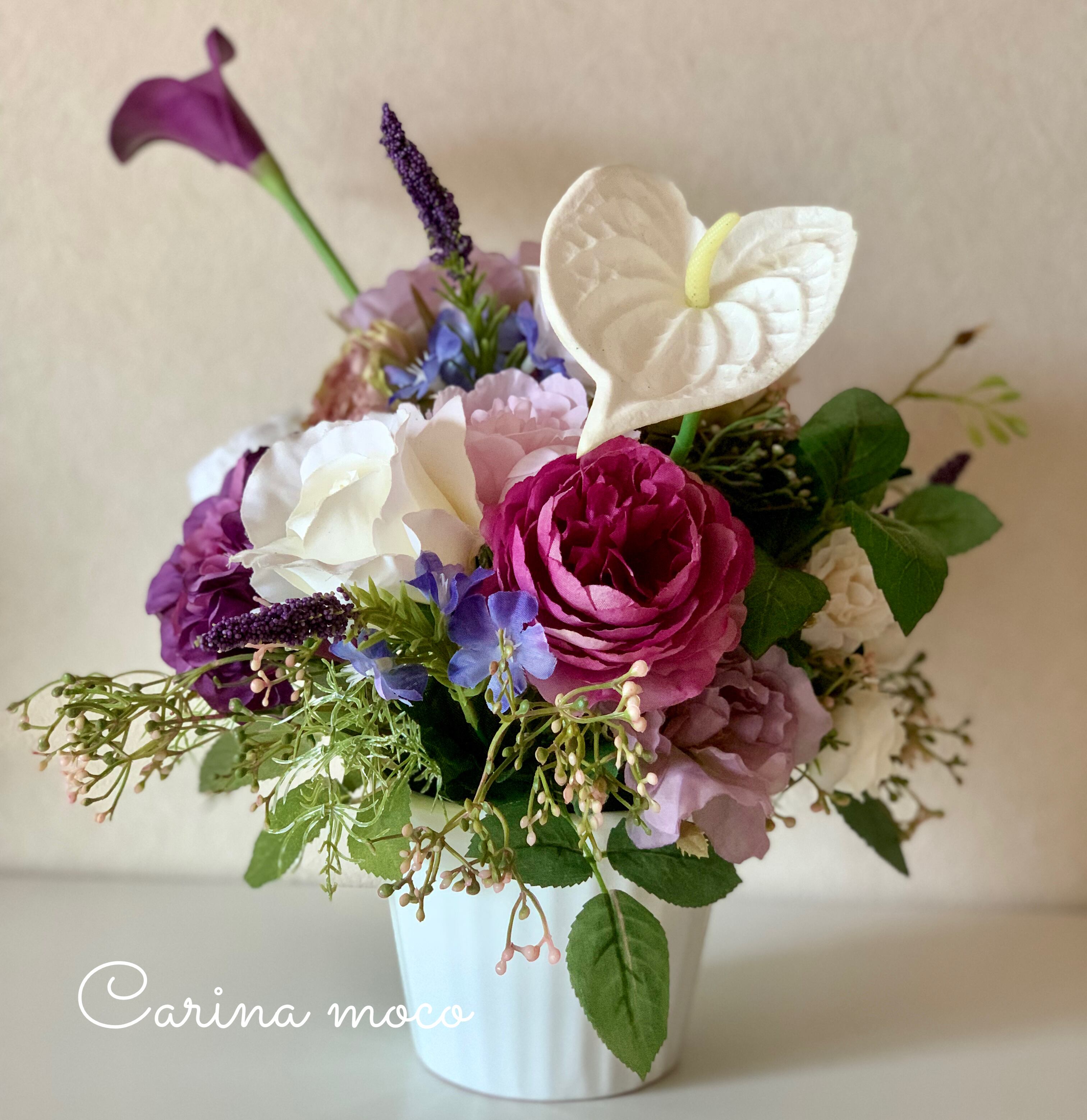 紫と白を基調にした、爽やかでエレガントなアレンジです。ラウンドアレンジのリクエストで作成しましたので、テーブルフラワーとして、どの角度から見ても美しく、少しずつ違う味わいをお楽しみいただけます。