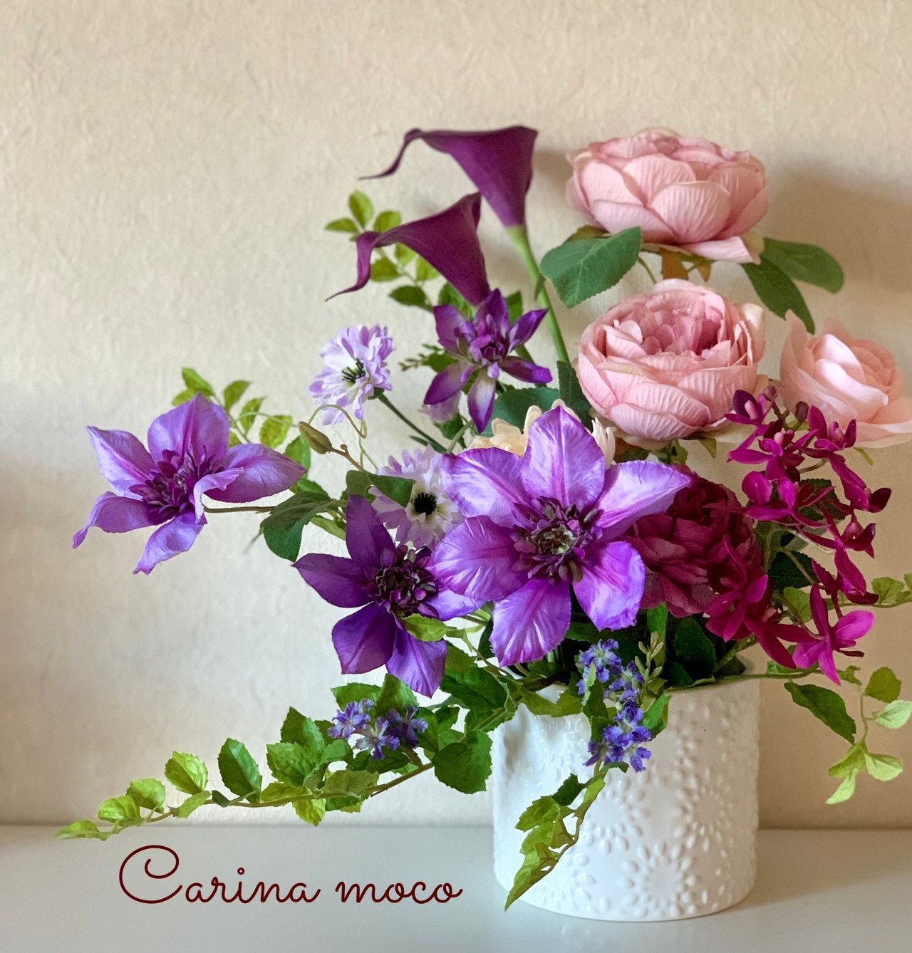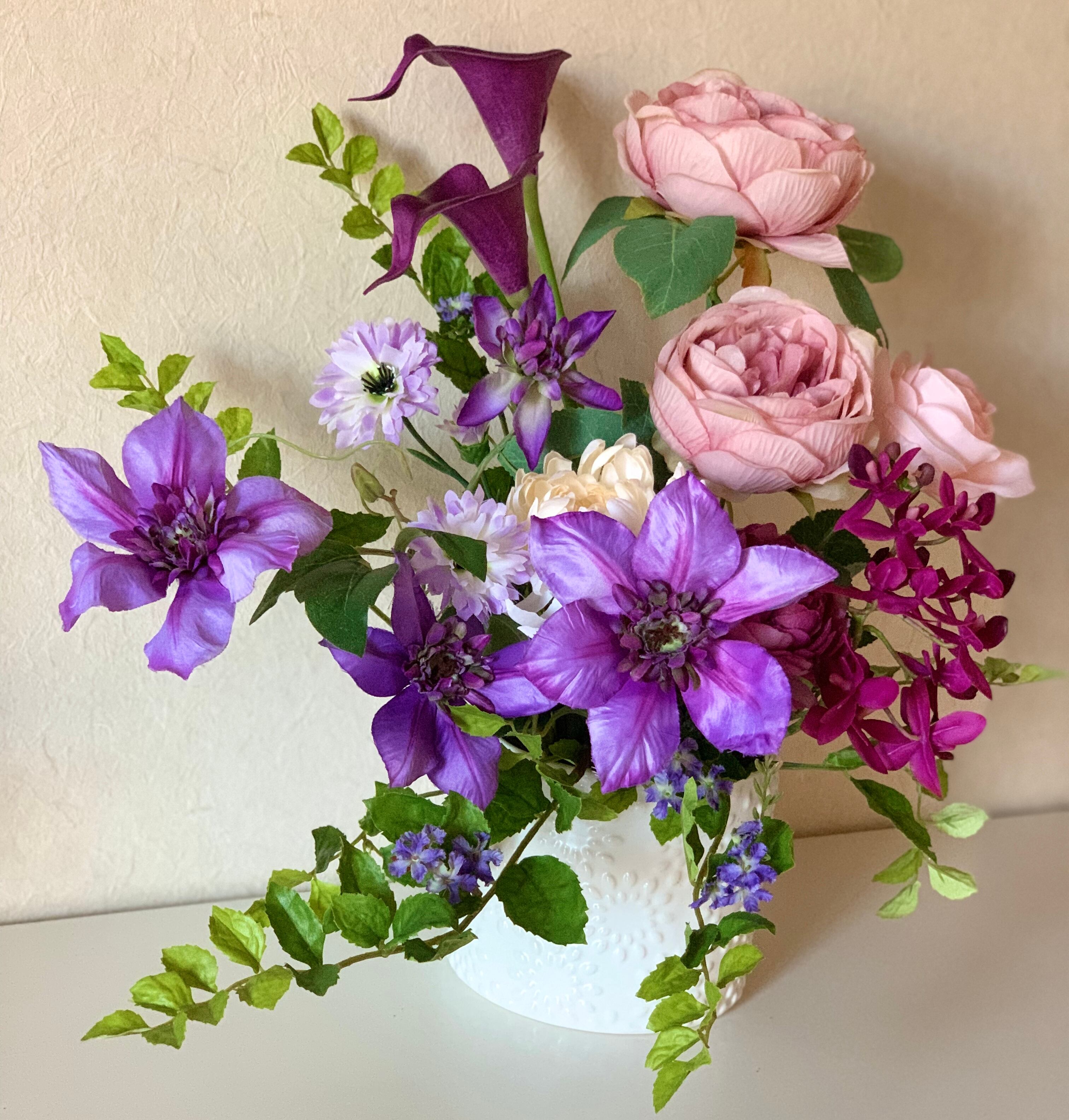 美しい高品質なクレマチスと、アンニュイなダスティーピンクのブリリアントローズの組み合わせがほんとうに美しいアレンジです。