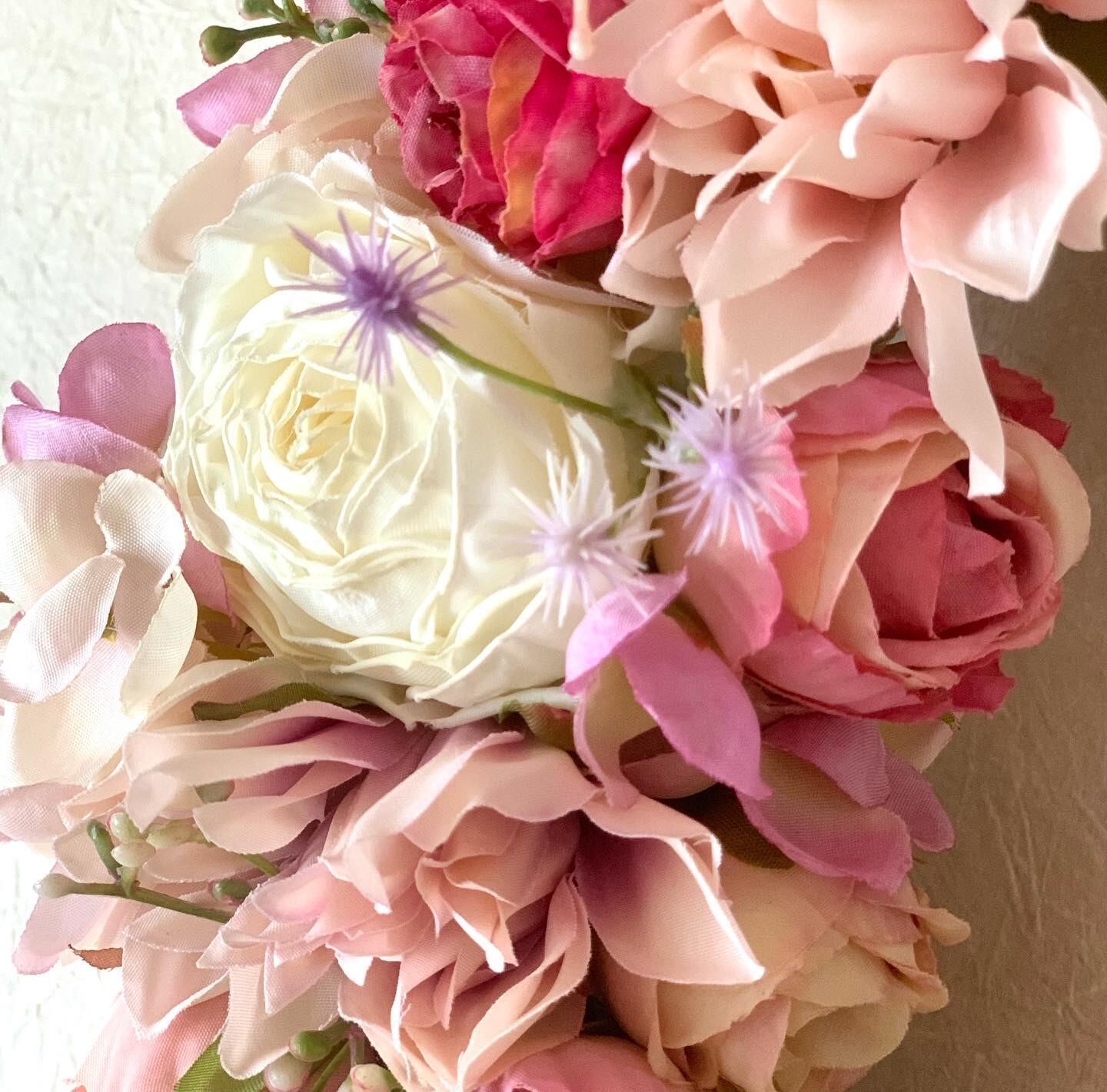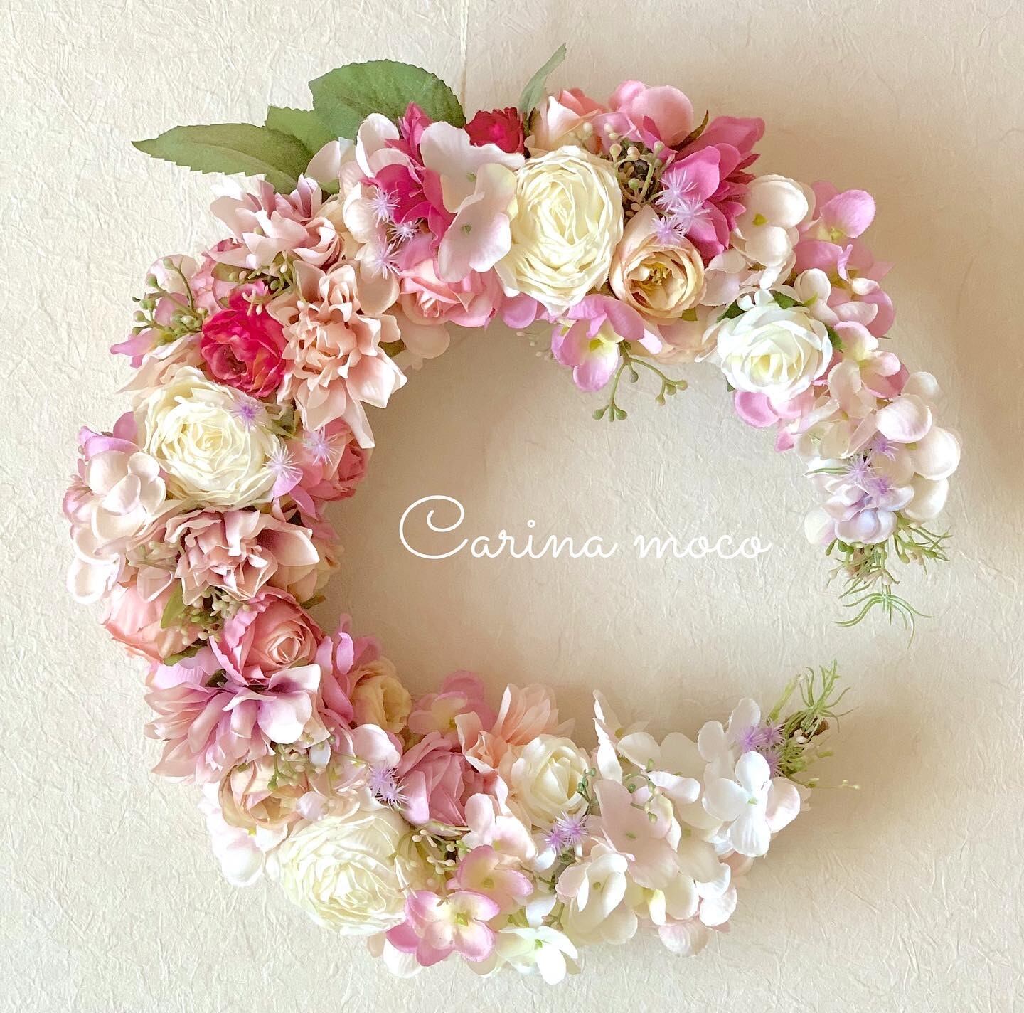 美しいバラや紫陽花がギュギュッと詰まった、三日月形のリースです。