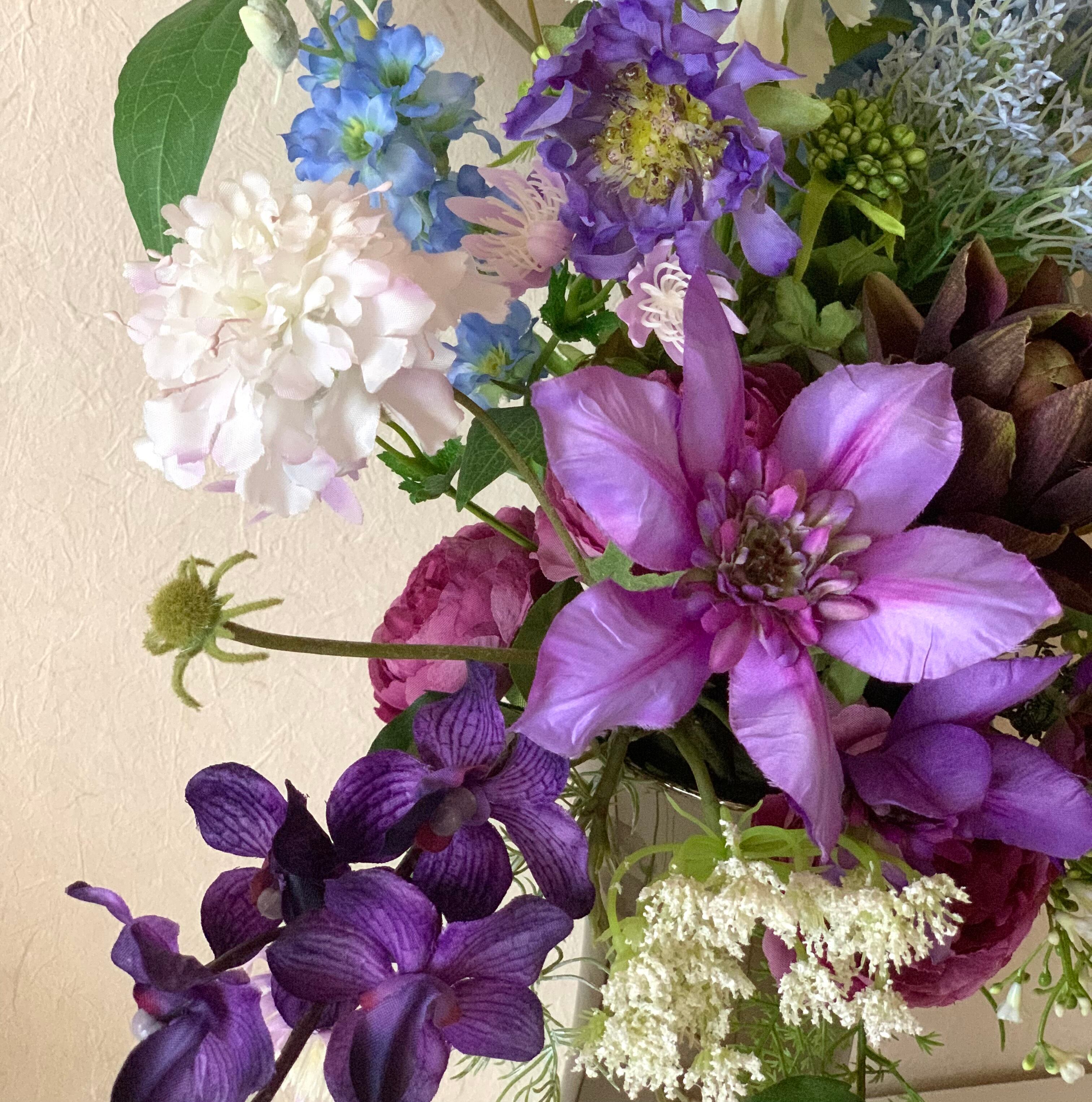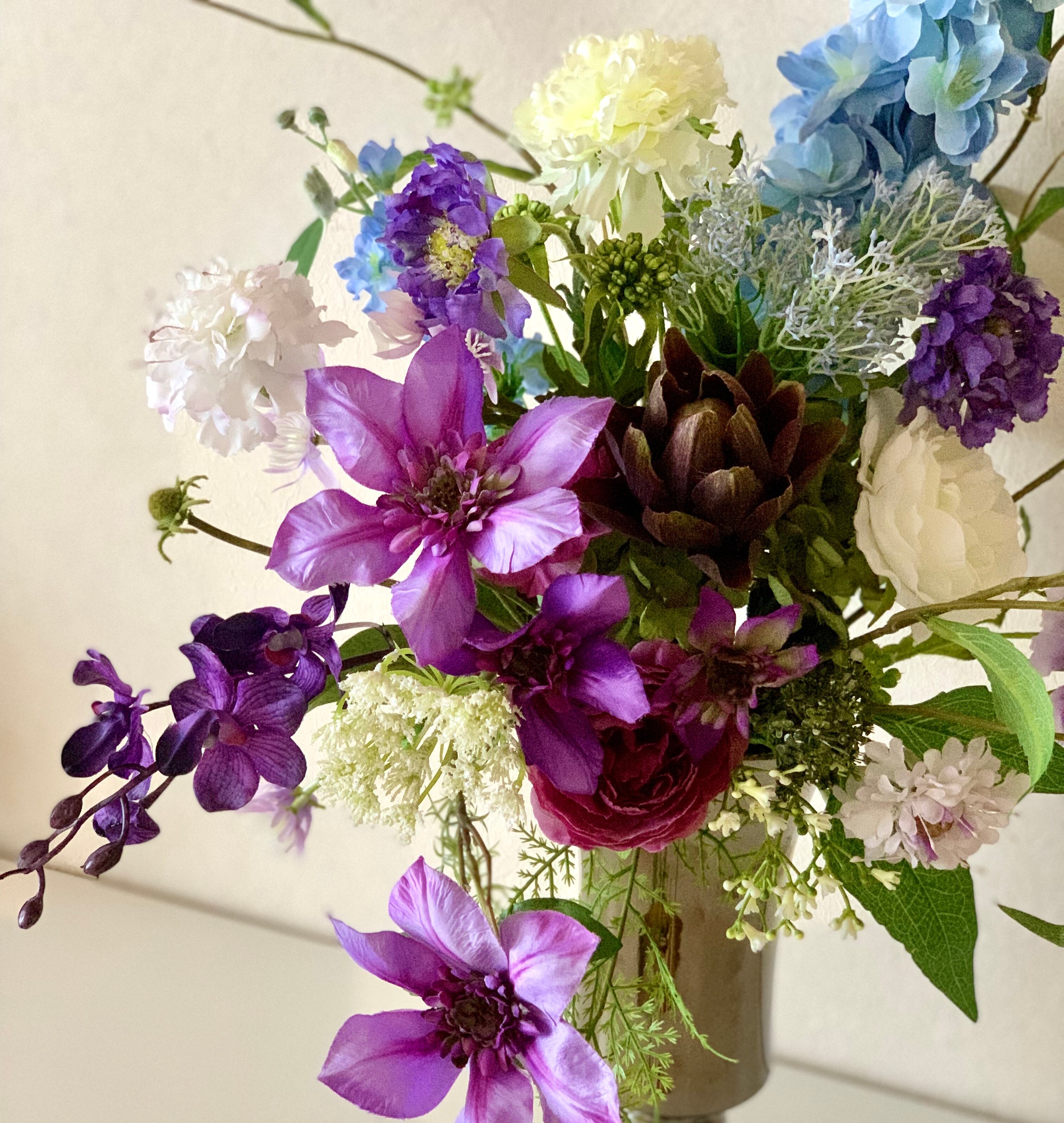 秋咲のクレマチスとバラにスカビオサやラナンキュラスなどを加えた、クールダウンする色あいながら、それはそれは美しい紫のグラデーションが印象的なアレンジです。写真より実物が数段素晴らしいのですが、なかなか美しく撮れません。