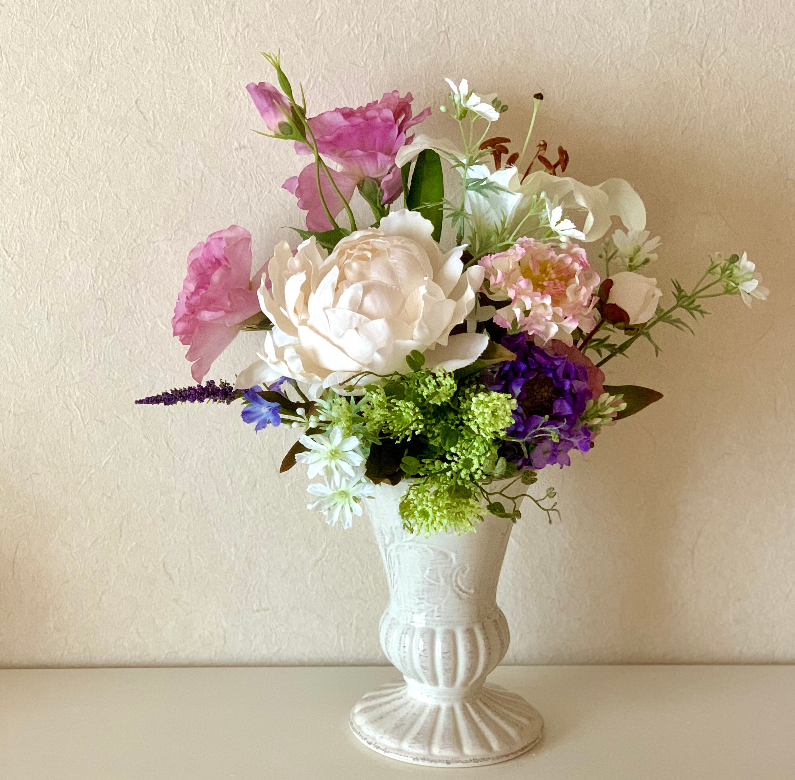 野に揺れる花や、スカビオサがお好きだったお母様の御仏前に置かれる花を…というリクエストでお作りしたこの花は、もともとあった花瓶に挿せるよう、ブーケ仕様にしてあります。