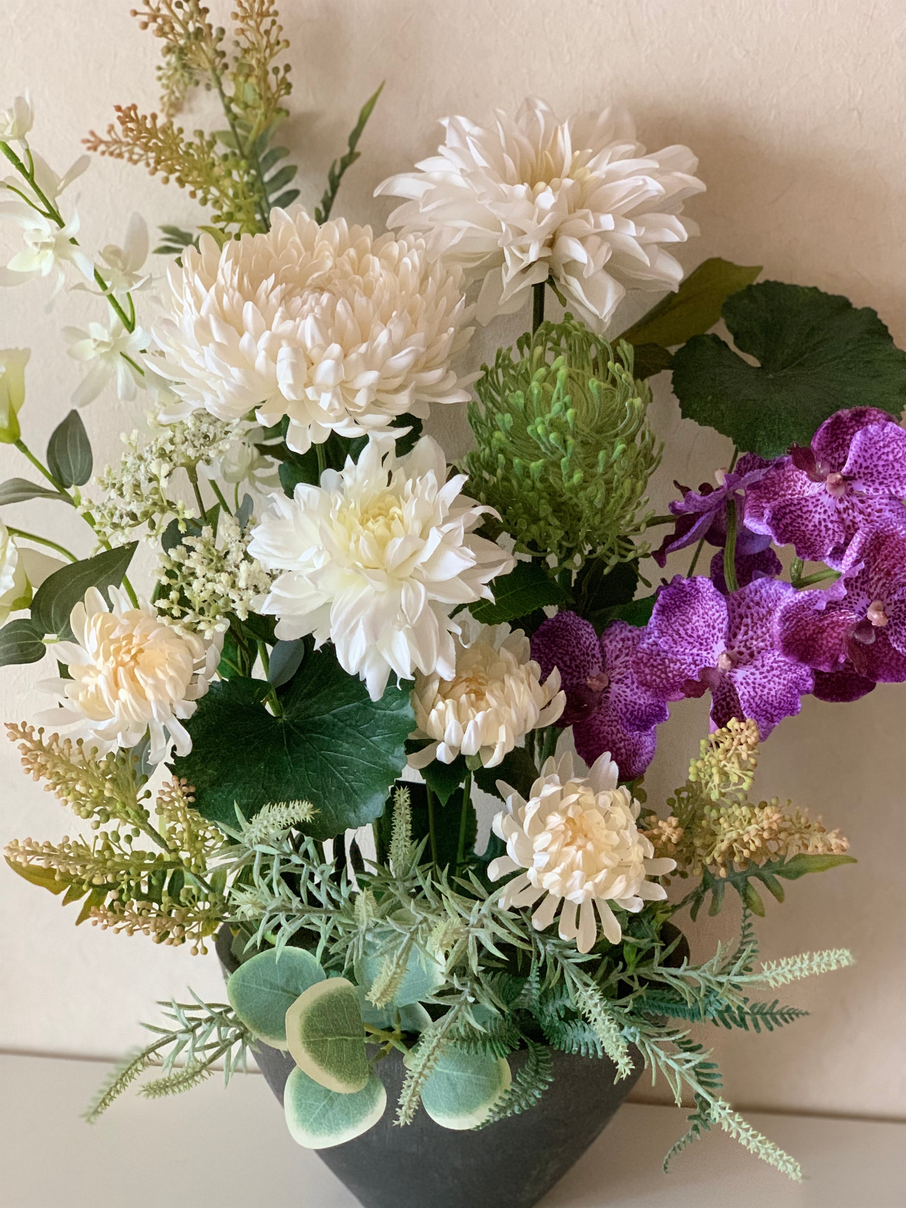 お亡くなりになられてからまだ一年経っていないので、基本的には白い花を送ります。ですが今回は、お二人のお好きだったという、江戸紫の蘭を加えました。