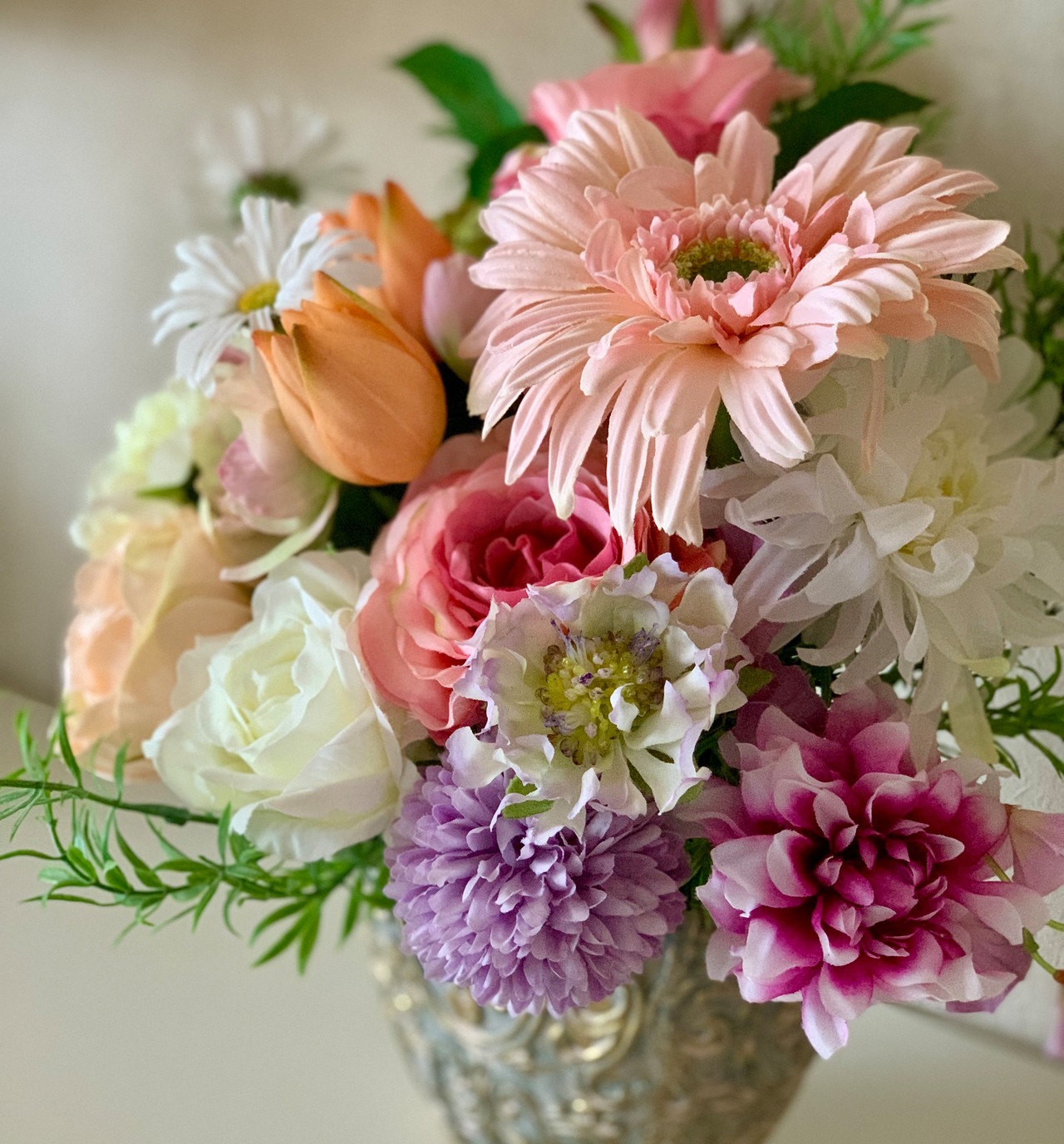 お花は、バラ、ガーベラ、スカビオサ、クリスマスローズ、ダリア、ポンポンマム、マーガレットなどをローズマリーで囲っています。