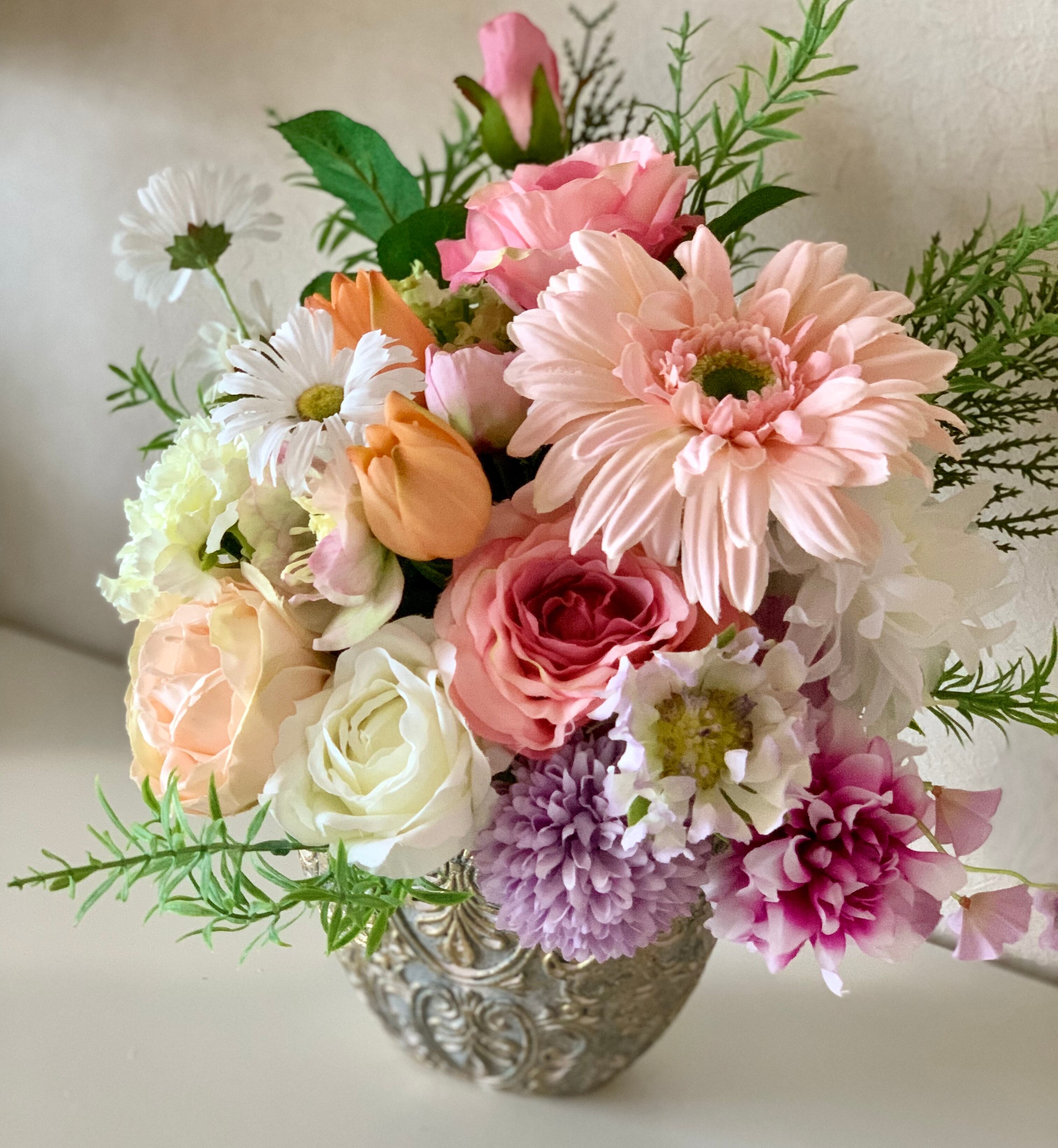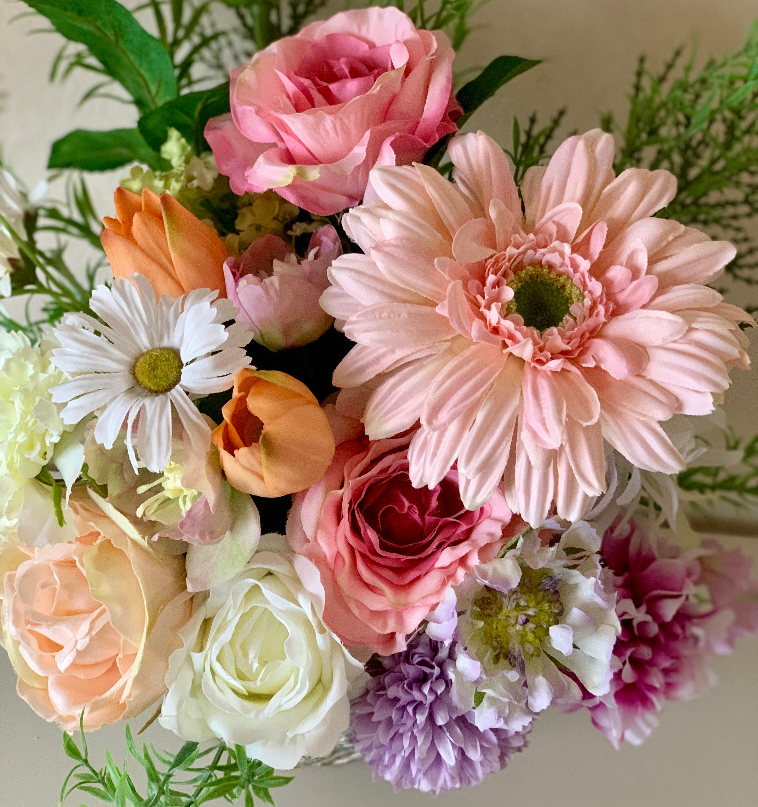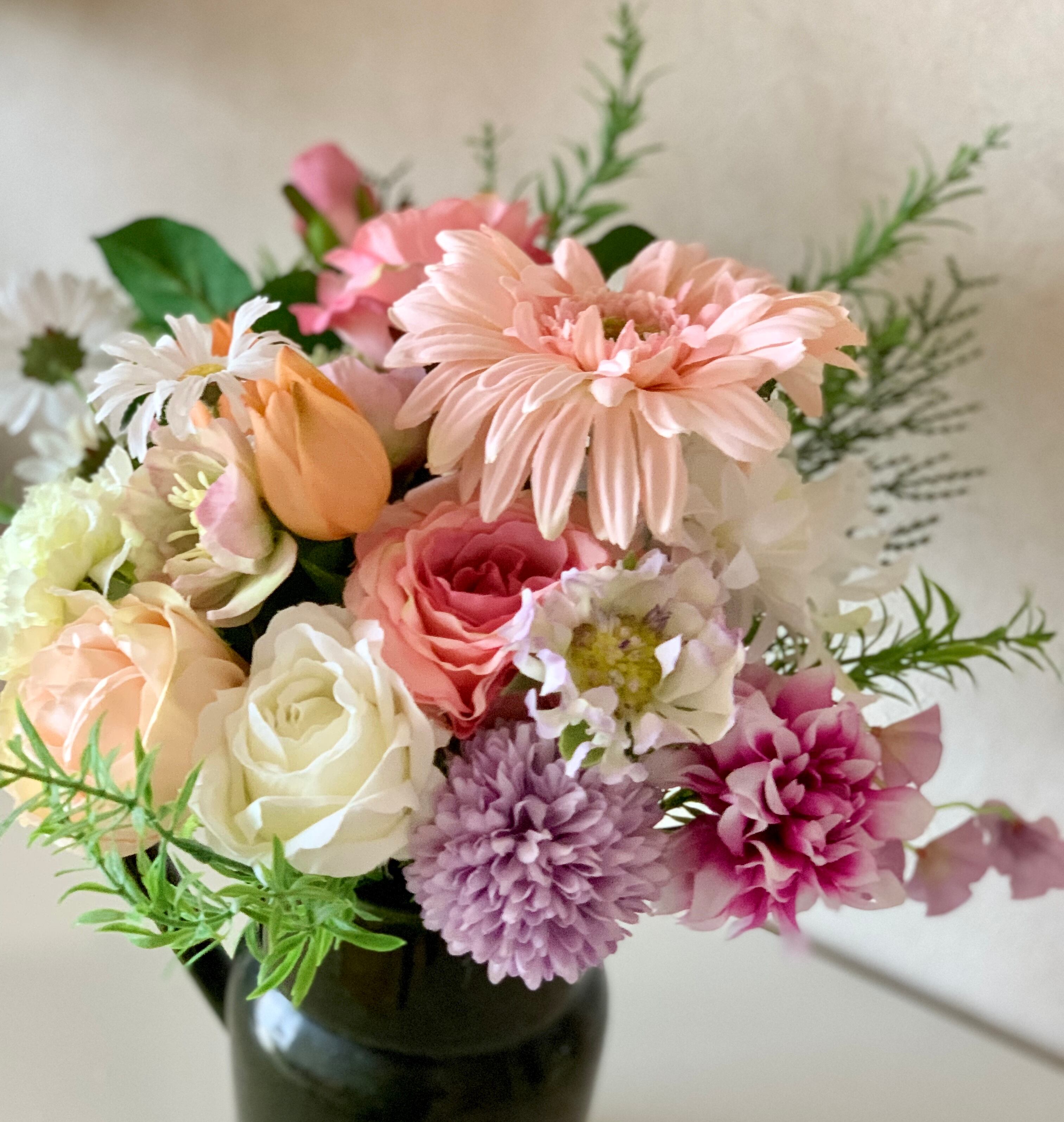 リクエストは「見ていて、にまにましてしまうような、シアワセな気持ちになるブーケ」ということでしたが、置かれるお部屋が東南角部屋、グリーンの側に置く…ということと、この方のイメージのカラーを考えまして、こんな感じになりました。
