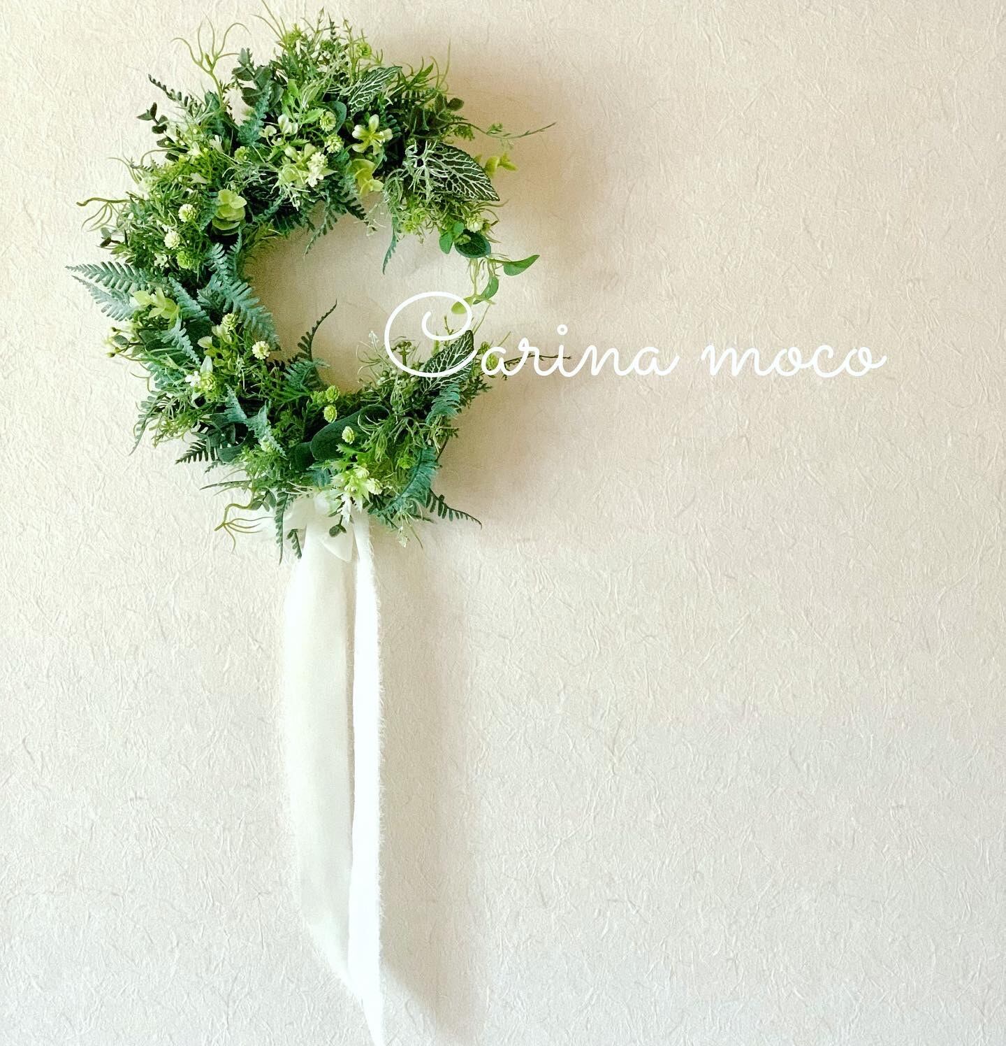 本体のリースは、いろいろなグリーンが美しい、シンプルな三日月型のリースでシーズンを問いません。