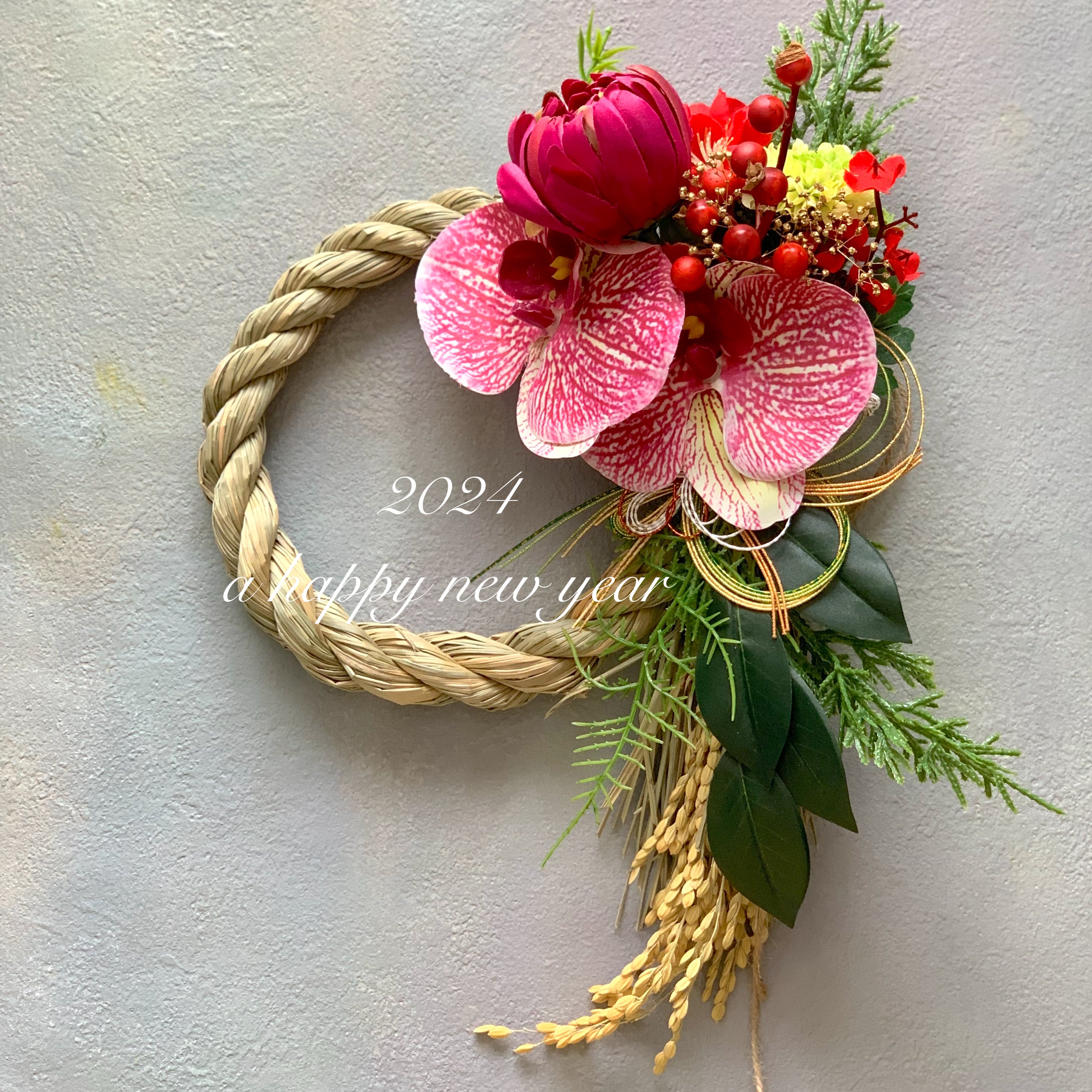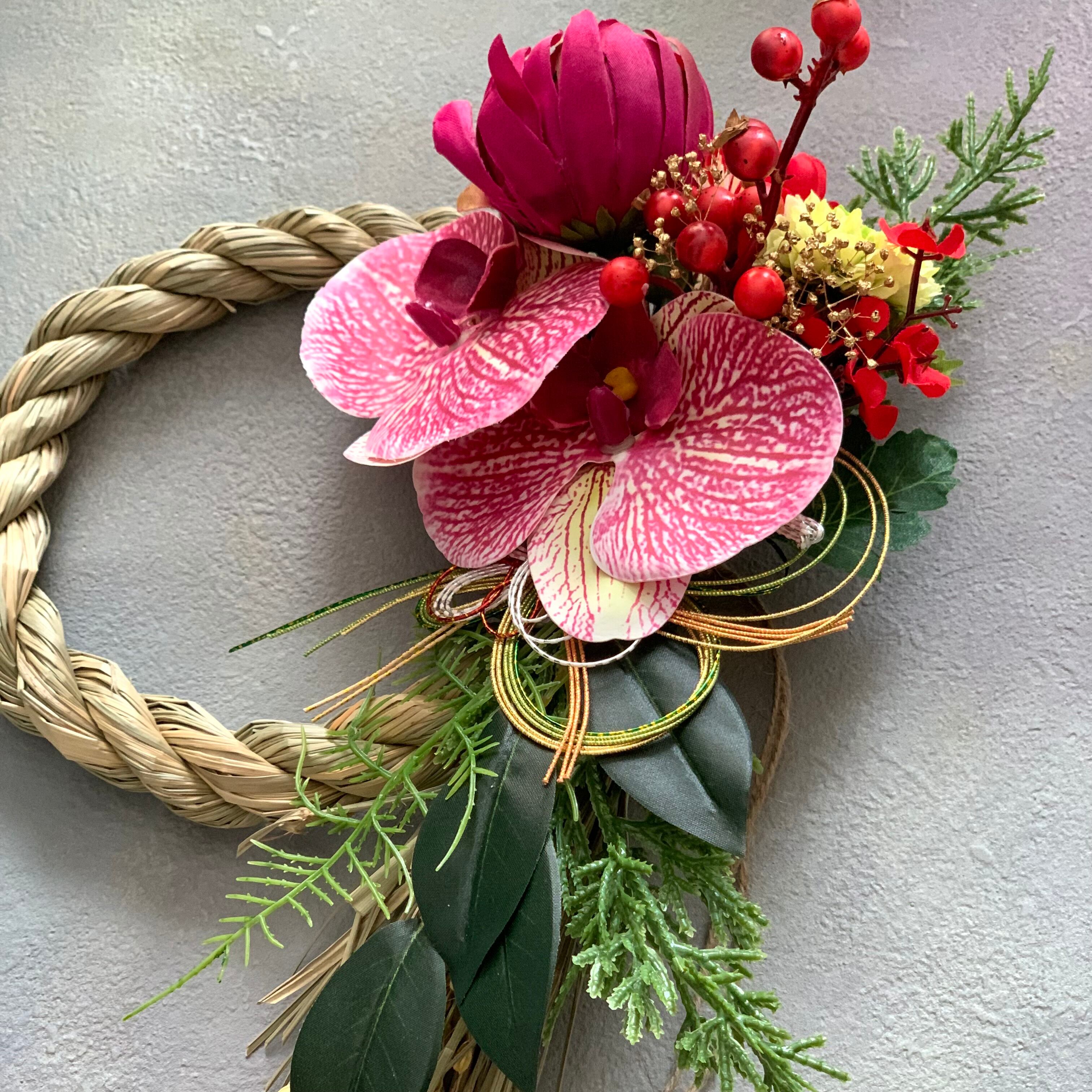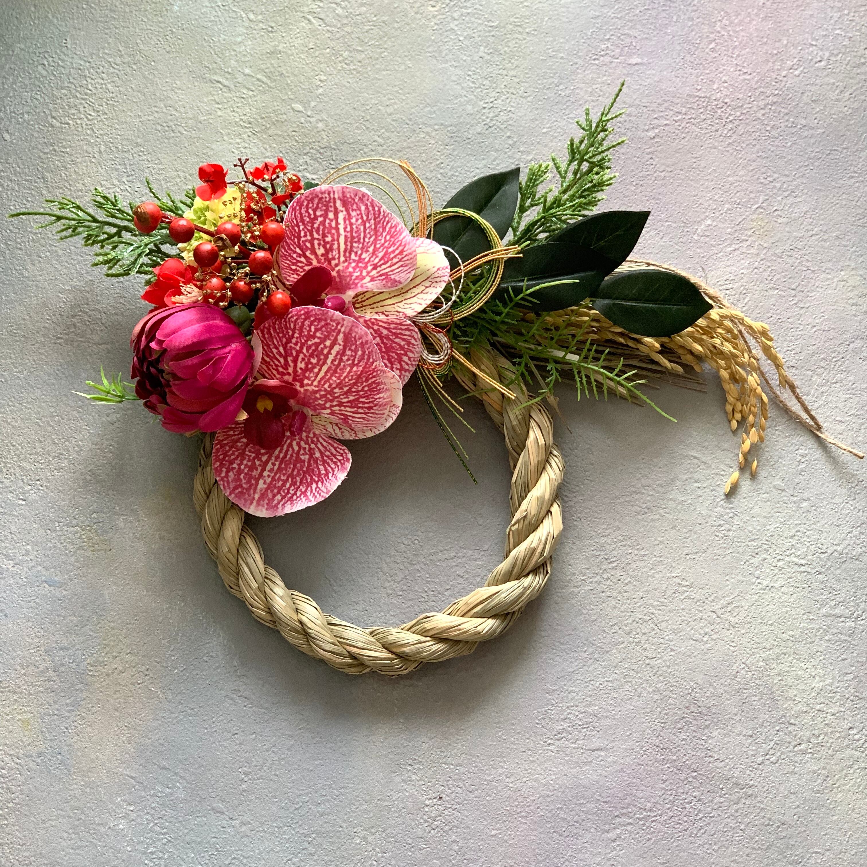 しめ縄、稲穂、かすみ草以外は、アーティフィシャルフラワーで構成しております。