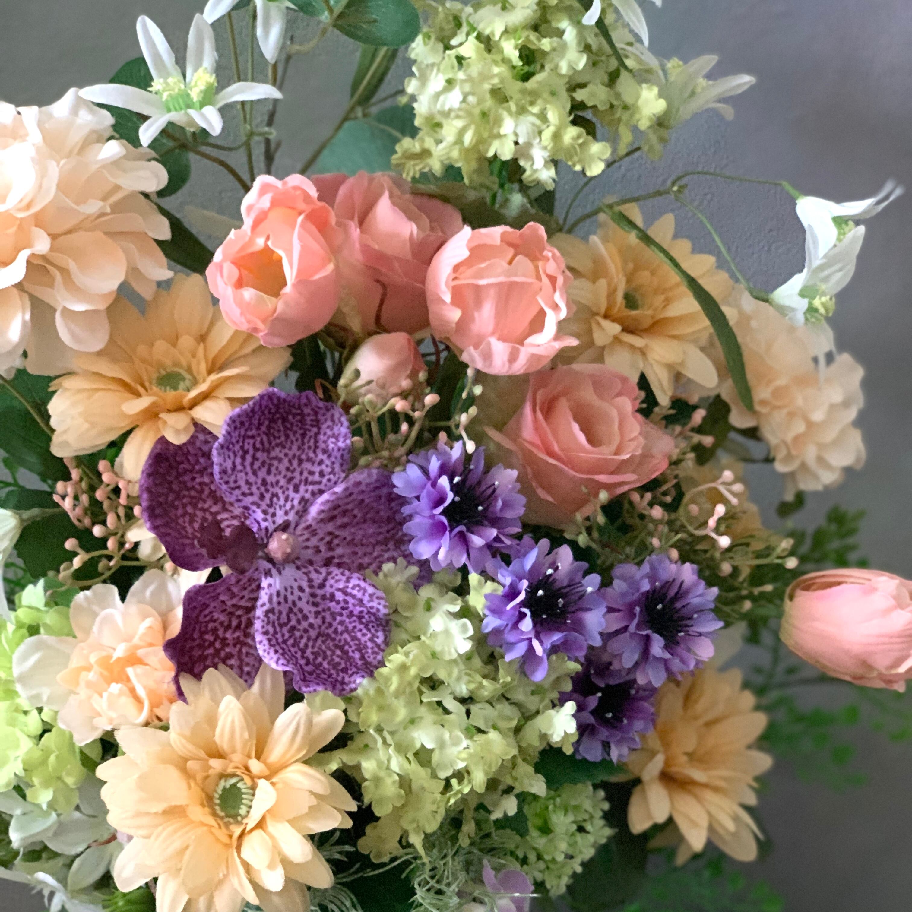 淡いオレンジ、白、紫でまとめてみましたら、すっきりした中に、なんとも言えない温かみを感じ、介護をされてるお母様にぴったりかなと思いました。