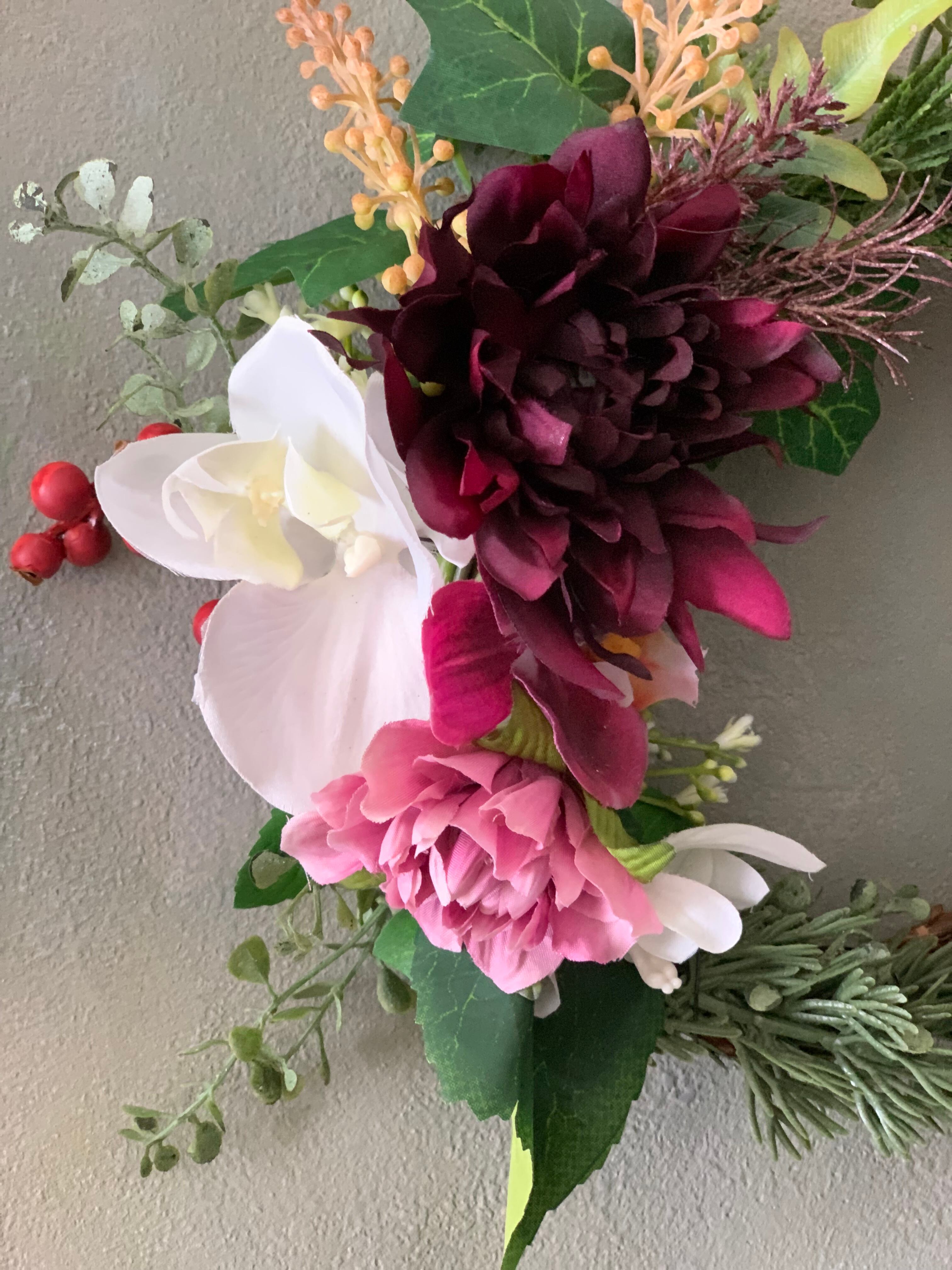 これには薔薇を予測していましたが、薔薇ではない…と。それでダリアにしました。同じくモーブなダリアも入れてあります。