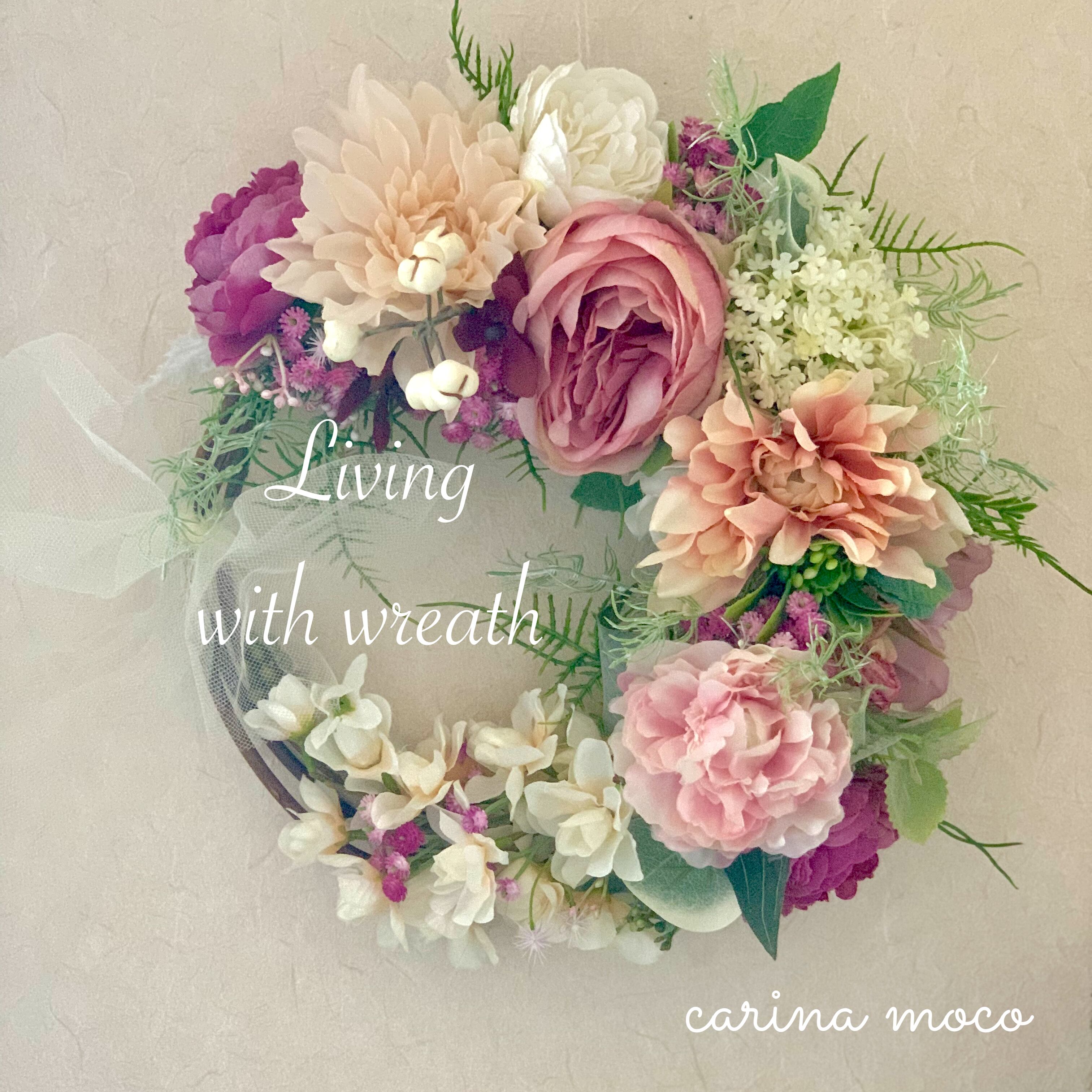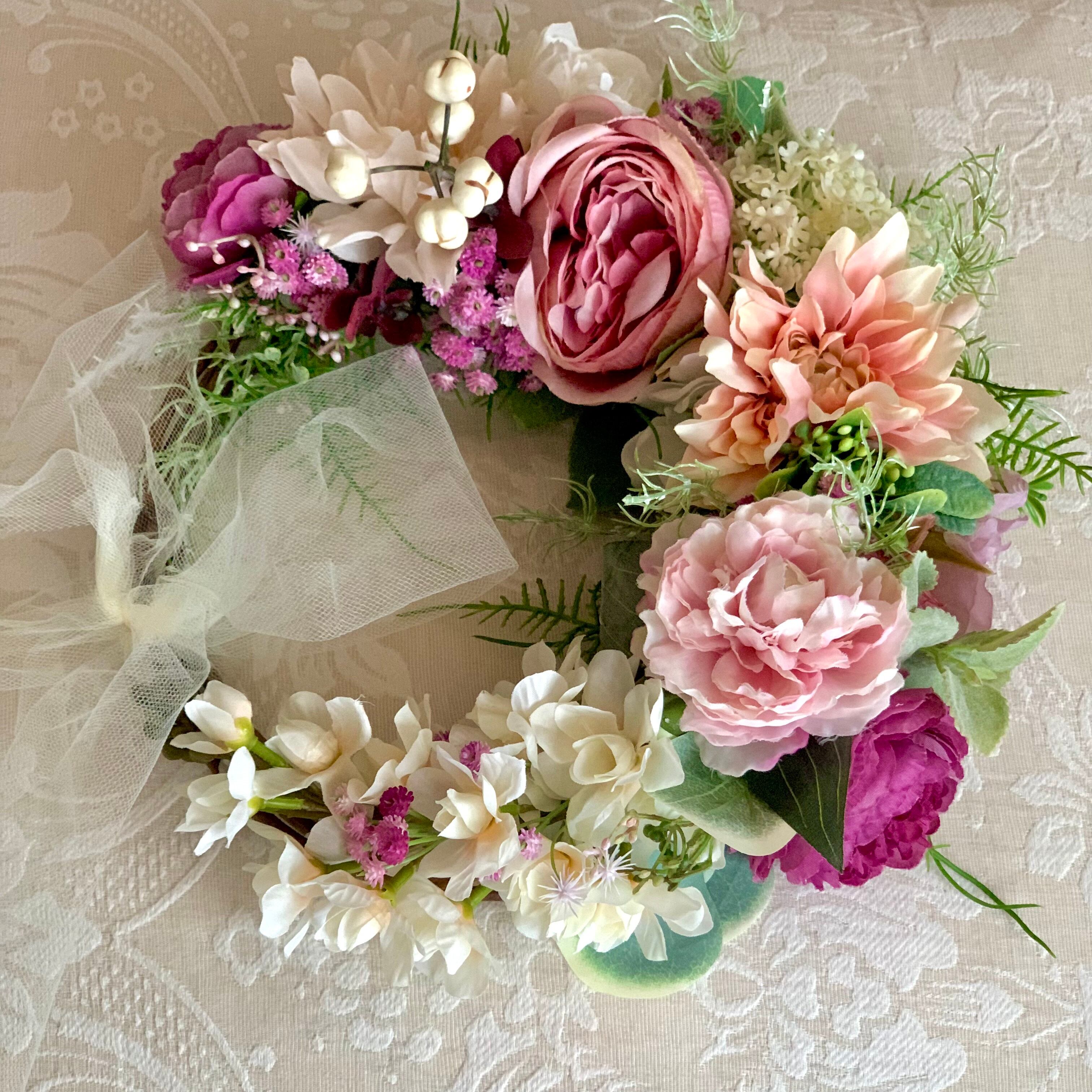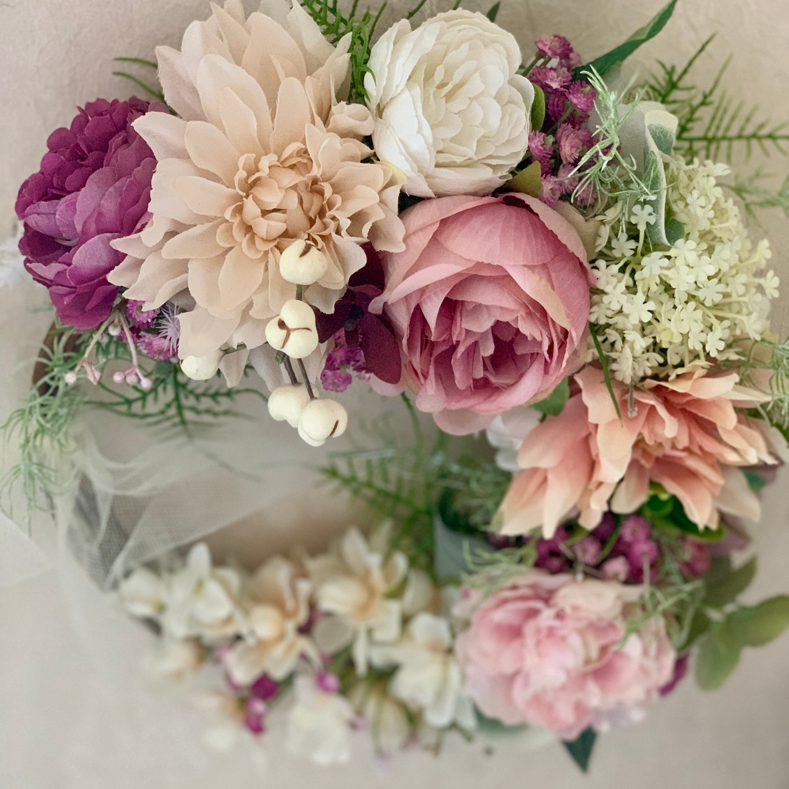 当初は二つのリースを別に作ろうかと思いましたが、ずっと彼女に作りたかったピンクのリースを作る機会が来た!…とばかりに内心大興奮╰(*´︶`*)╯♡