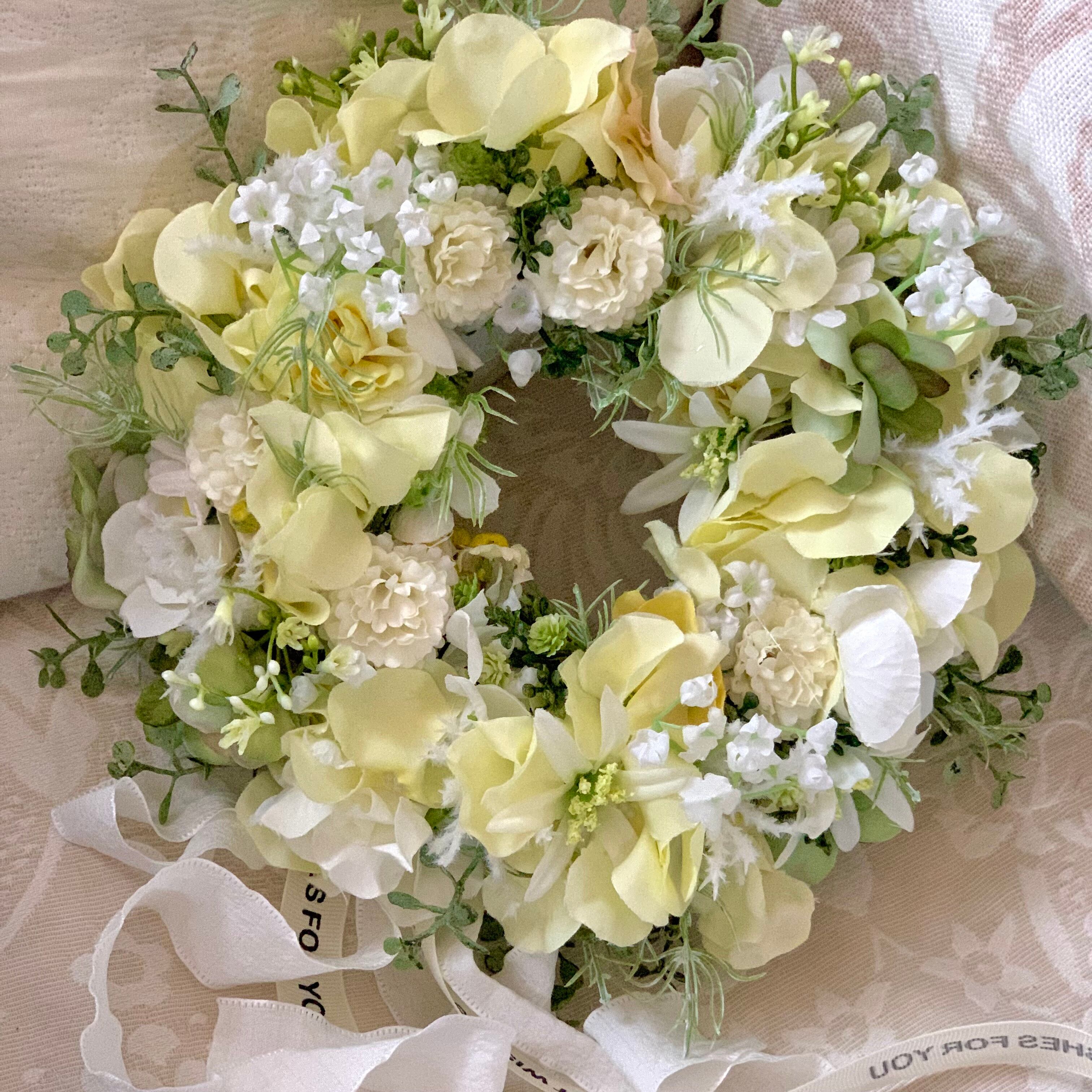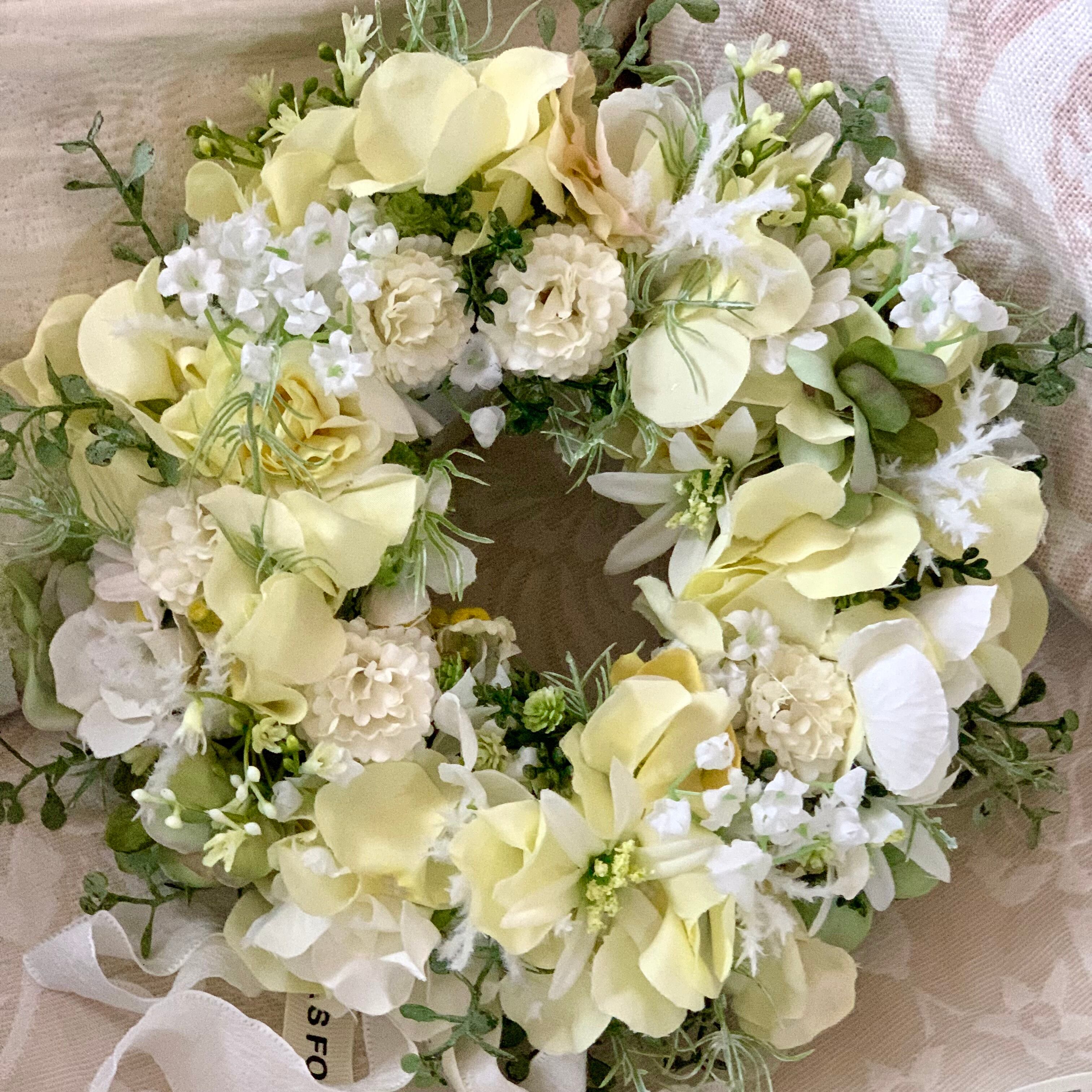 クリーム色の可憐な花々が咲き誇る、クリームカラーの紫陽花と小花のミニリース。